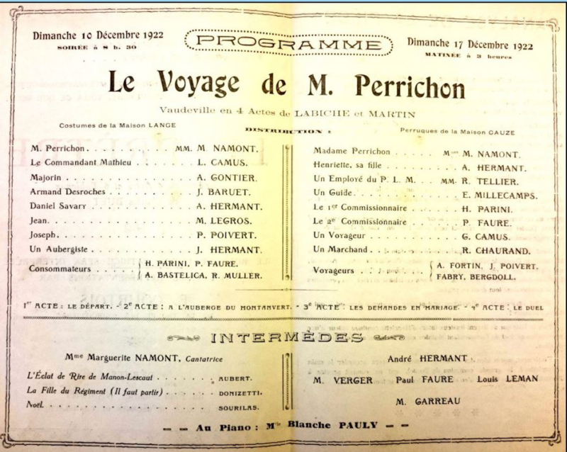 Et les pièces se succèdent : Jean la croûte de Georges Letervanic, pièce dramatique en vers et en 2 actes ; Asile de nuit de Jean Maurey, comédie en un acte ;  La cloche des brouillards de Bernard Valoris, en 4 actes et 6 tableaux ; La lumière qui renaît de Georges Delonce, pièce en 3 actes ; Le voyage de M. Perrichon de Labiche, vaudeville en 4 actes ; Les crampons de sauvetage d’Astruc Elonir, comédie en 4 actes ; Les piastres rouges de Charles Leroy-Villars ; Mirage d’Afrique de Guy Lannois, drame religieux et patriotique en 4 actes.