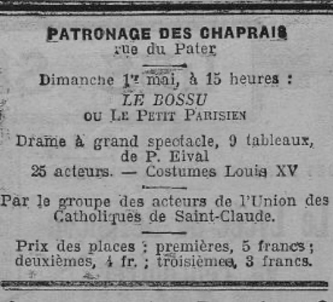 Une autre activité rencontre beaucoup de succès : le théâtre. C’est là qu’est représentée pour la première fois « La Crêche », avec le personnage truculent de Barbizier. Le répertoire est joyeux et léger et les pièces à la mode se succèdent. Une recherche rapide permet d’avancer que ces pièces de théâtre sont montées dans de nombreuses paroisses de France pour leur kermesse ou soirées récréatives.