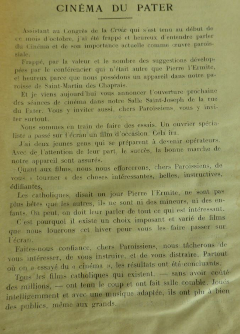 Dès octobre 1927, le curé Cretin qui revient d’un congrès de La Croix, annonce dans le bulletin paroissial qu’il lance le cinéma dans la salle Saint-Joseph de la rue du Pater. Cinéma qui détrônera bientôt le théâtre.