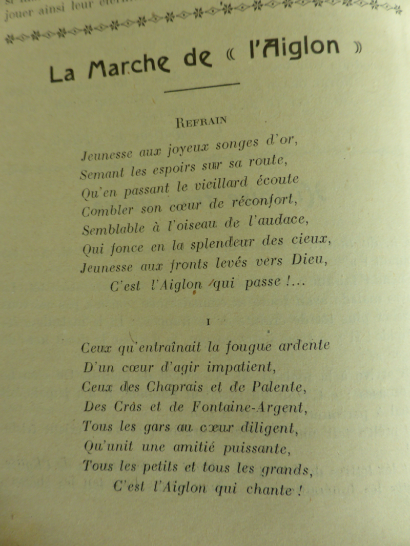 Et sur l’air de la chanson La Madelon, l’abbé Devaux et Pierre CONFAIS actualise la Marche de l’Aiglon créée en 1925