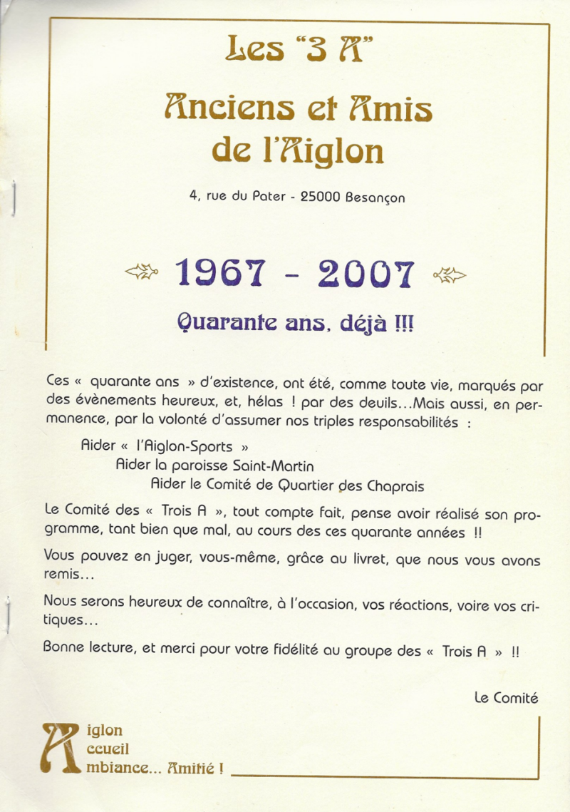 . En 1967, l’Aiglon compte beaucoup d’anciens qui décident de se regrouper dans une association intitulée  Les « 3A » qui signifient Anciens et Amis de l’Aiglon.