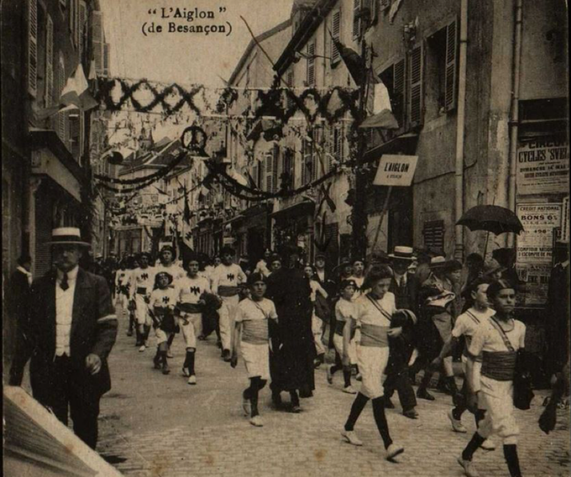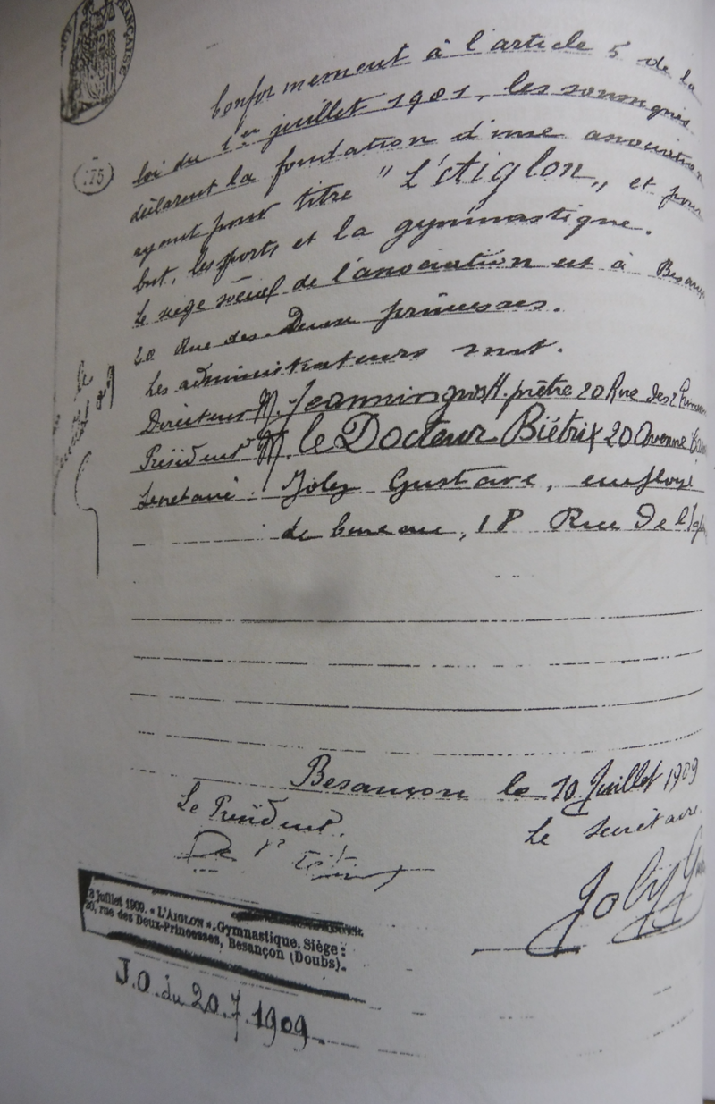 «  18 juillet 1909. « L’Aiglon ». Gymnastique. Siège : 20 rue des Deux Princesses. Besançon. Doubs ».