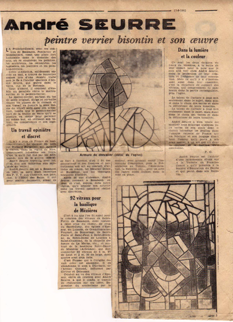 En 1961 il est à Charleville-Mézières à la basilique Notre Dame d’Espérance, un chantier qu’il ne pourra terminer puisqu’il compte 62 verrières. C’est le peintre René Durrbach qui dessine les vitraux. Le petit fils d’André Seurre, Michel qui a rejoint son grand-père en 1970 et qui va continuer son œuvre après le décès d’André arrête le chantier sur lequel il perd de l’argent.