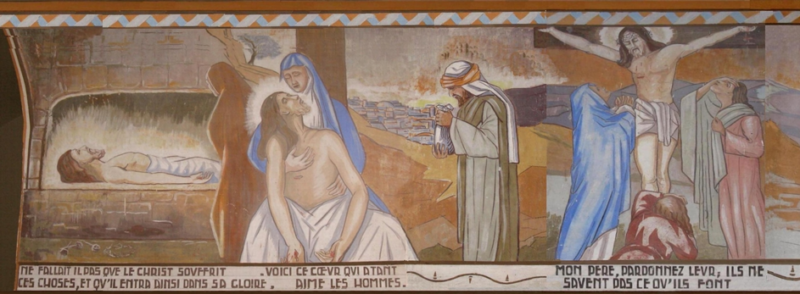 André Seurre a beaucoup travaillé pour et dans les églises. Etait-il attaché à la religion ? Réponse incertaine. Mais ses chemins de croix à hauteur d’homme, ses fresques monumentales portent si bien le message chrétien qu’il faut se tourner à nouveau vers Maurice Denis. Lequel «… traversa une crise mystique adolescent, … a pensé devenir peintre moine comme Fra Angelico » (encore un fresquiste !) était profondément chrétien, militant de sa foi. Il réalisa dans sa propriété de St Germain-en-Laye (un ancien hôpital où se trouve aujourd’hui le musée qui lui est consacré) entre 19xx et 19xx une œuvre qui constitue peut-être le facteur initial de la carrière de Seurre.