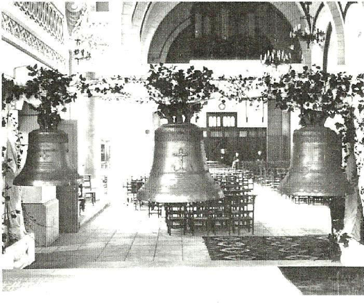 Relevons également que la cérémonie se termina à 11 heures ! Car selon le rituel religieux elles ont été l’objet d’une bénédiction de sel et d’eau, d’un lavage et d’un enfumage, en dessous, avec encensoirs. Puis, discours de Mgr Humbrecht. A la fin de la cérémonie parrains et marraines ont distribué des dragées tandis que l’on revêtait chaque cloche d’une robe de satin blanc avec des rubans de couleur différente pour chacune d’elles.