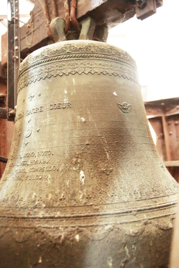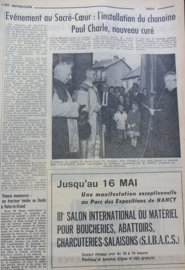 Depuis plusieurs jours, ainsi du reste que L’Eclair Comtois l’avait annoncé, les trois cloches qui bientôt prendront place dans les tours, pour animer la vie paroissiale, étaient exposées à l’entrée du chœur du Sacré-Cœur, sur l’échafaudage ad-hoc, à la place de la table de communion qui avait été enlevée pour la circonstance »…