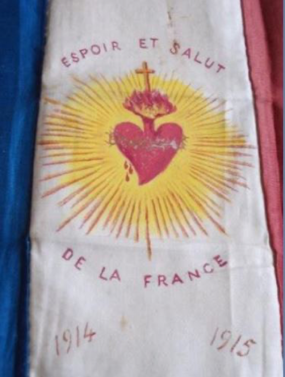 Mgr. GAUTHEY, dans sa lettre, justifiait le culte du Sacré-Cœur et en faisait l’historique. Il affirmait qu’au Front, beaucoup de nos soldats portaient sur eux son insigne et il faisait allusion à l’active campagne qu’il venait de mener – sans succès mais à la grande colère des autorités civiles attachées à la laïcité de l’État – pour obtenir officiellement l’adjonction de l’emblème du Sacré-Cœur au drapeau tricolore.