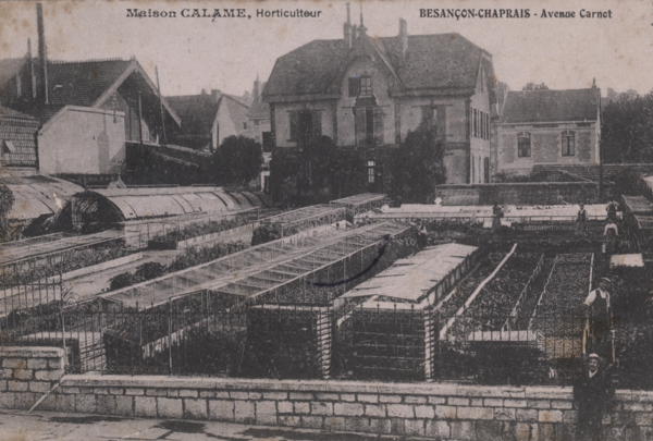 Derrière les serres Calame, au centre, la maison de campagne devenue la Cure derrière le Sacré-Cœur Mémoire Vive Besançon.
