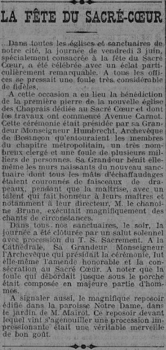 « Une cérémonie touchante et que l’on voit assez rarement s’est déroulée dimanche matin, en l’église votive du Sacré-Cœur, sous la présidence de Sa Grandeur Monseigneur Humbrecht, Archevêque de Besançon, celle de la bénédiction des cloches de la nouvelle Paroisse des Chaprais.