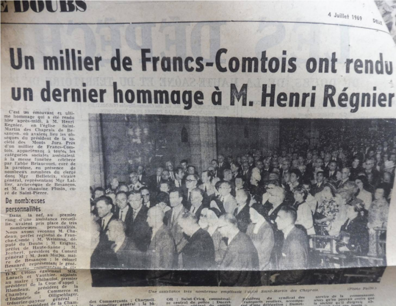 Henri Régnier décède à Besançon le 30 juin 1969. De nombreux bisontins ont alors participé à ses obsèques.