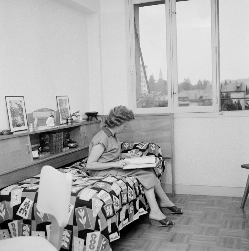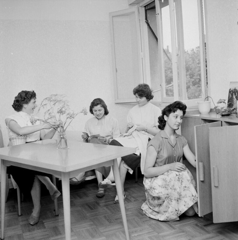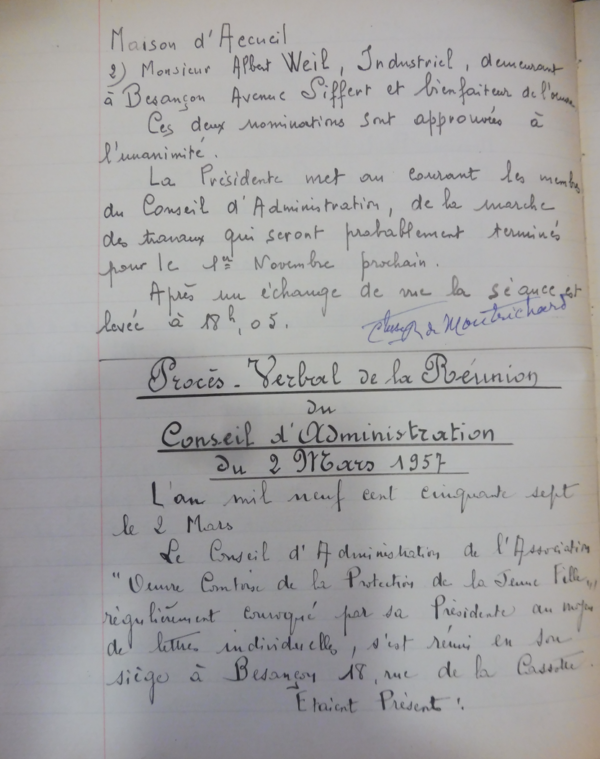 En l’état actuel de nos recherches, il n’est pas possible de dater avec exactitude l’arrivée de la première jeune fille au Foyer. Ce doit être au mois de novembre, puisque dans le dernier compte rendu du conseil d’administration du 3 juillet 1956, il y est indiqué que les travaux de construction du foyer doivent être terminés le 1er novembre 1956. Puis comme on peut le lire dans le cahier de délibérations du conseil d’administration, il n’y a pas eu de réunion avant 2 mars 1957. On peut supposer que le CA s’est réuni, d’une manière informelle, à plusieurs reprises pour faire le point des travaux et accueillir les premières résidentes. Les tâches ont certainement été très nombreuses.