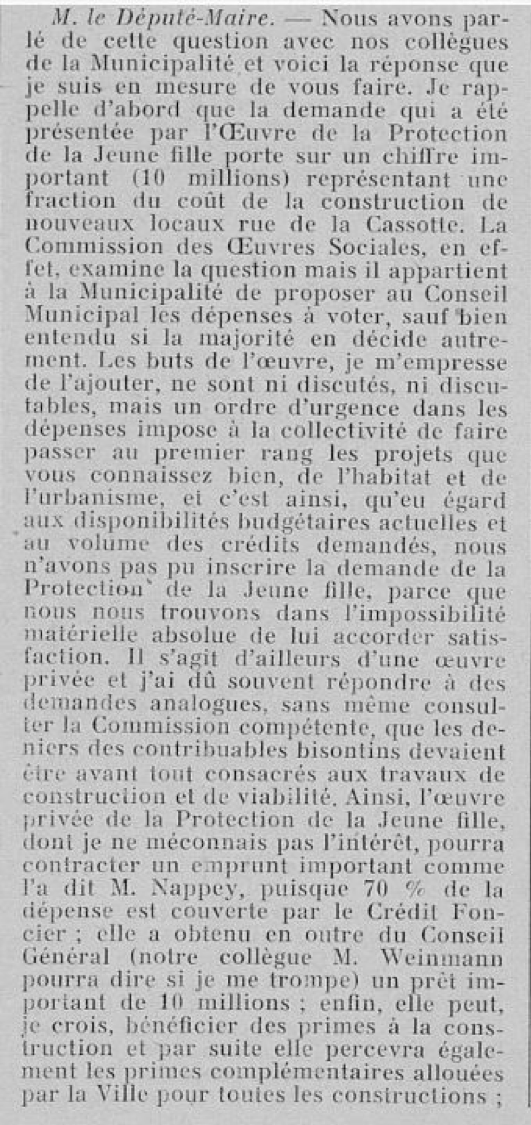 A Besançon, l’association sollicite la ville pour une subvention de 10 millions de francs. Un vif débat s’engage et le compte-rendu officiel de la délibération du 26 octobre 1953 occupe quelques 4 pages imprimées. Voir : https://memoirevive.besancon.fr/ark:/48565/vbx1h2zn803j/2ed2cbe6-37de-476f-a27c-169bffc302c5