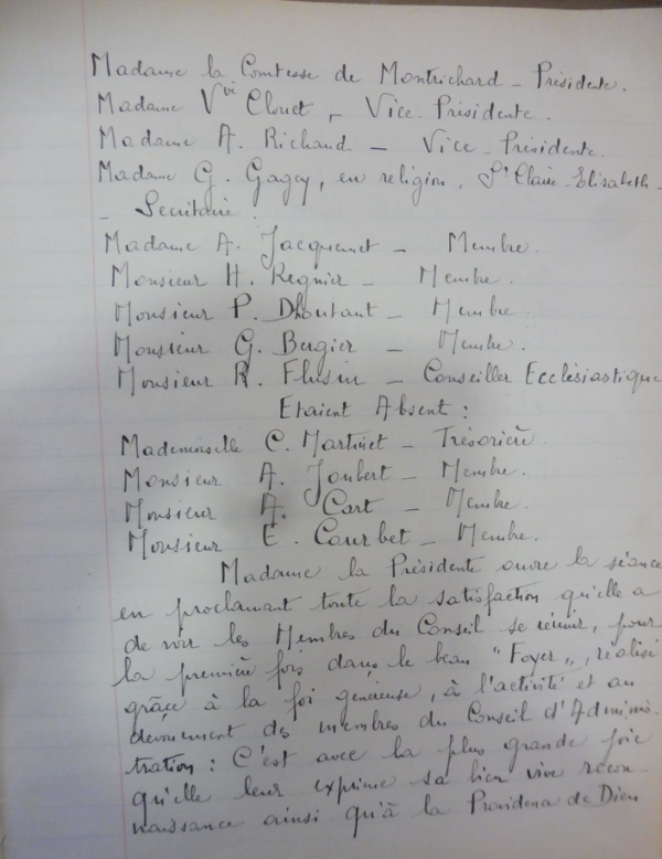 Sœur Claire Élisabeth de la communauté des Sœurs de la Charité, nom de famille Gabrielle Gagey assure le secrétariat Conseil d’administration mais elle ne travaille pas dans ce foyer : elle est par ailleurs directrice de l’école Jeanne d’Arc.