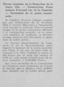 Le 23 décembre 1953, si le principe d’une subvention est adopté sous forme d’une avance de la prime à la construction versée par la ville, en complément de celle de l’Etat, le montant n’est pas fixé car il convient alors d’obtenir l’information des services de l’Etat en ce qui concerne cette prime. Mais cette dernière peut, en ce qui concerne la ville, être étalée sur 20 ans. Aussi, compte-tenu du besoin en capital afin de construire ce foyer, il est décidé à l’unanimité de la verser en une seule fois.