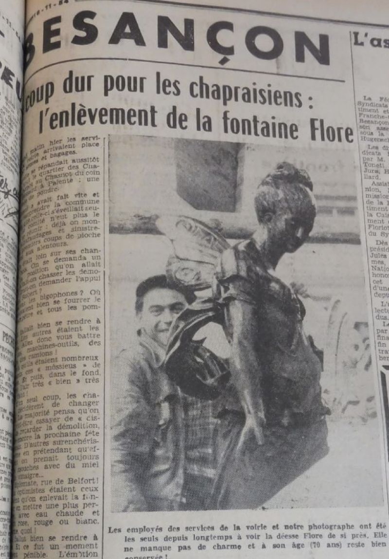 Fin décembre 1941, juste avant noël : nouvelle catastrophe aux Chaprais ! Flore est arrachée de sa colonne juchée sur sa fontaine. Comme d’autres sculptures et monuments en bronze de Besançon ! Entre autres le monument à la gloire de Proudhon au rond point des Bains, ou le marquis Jouffroy d’Abbans devant l’église de la Madeleine.