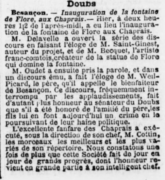 Dès le printemps 1874, Gustave OUDET ; alors maire de Besançon a l’idée d’une fontaine décorative monumentale aux Chaprais en l’honneur de son ami conseiller municipal Adolphe Veil-Picard, banquier de son état et généreux donateur de sommes considérables tant pour les grands travaux d’édilité comme l’on dit alors, que pour les écoles, bibliothèques et sociétés de bienfaisance. Il veut ainsi, au nom de la ville, remercier ce grand homme des dons qu’il a faits pour que l’eau potable soit conduite aux Chaprais mais aussi à Saint-Claude et Saint Ferjeux.