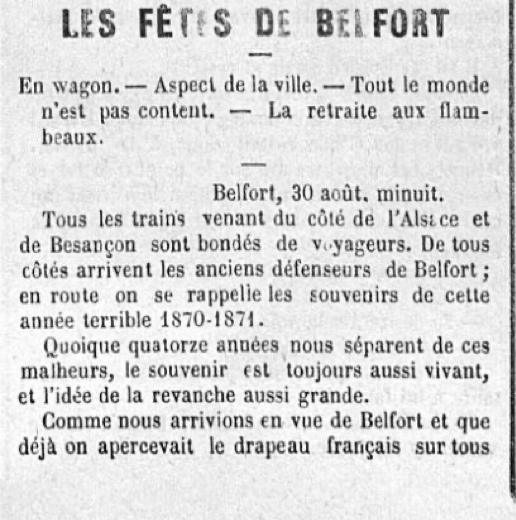 Malheureusement, dans la presse régionale, un événement vient éclipser l’éclat de cette journée ! En effet, c’est la fête à Belfort qui fait la une des journaux ! Parce qu’on y a inauguré un monument à la gloire du capitaine Denfert Rochereau et…d’Auguste Thiers qui visiblement a su effacer dans la conscience collective son rôle de sabreur des insurgés de la Commune de Paris…