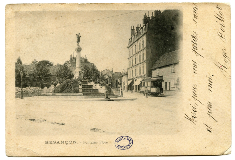 Printemps 1897, grosse surprise pour Flore, un tramway électrique passe à ses pieds pour rejoindre la gare Viotte. Et très rapidement une ligne nouvelle de 86,70 mètres conduit les bisontins de la place Flore au cimetière des Chaprais . Elle emprunte une petite partie de la rue de Belfort puis la rue de l’Eglise. Le terminus est devant l’entrée du cimetière de la rue de l’Eglise. Ce tracé sera par la suite supprimé, du fait de la faible fréquentation de la ligne et le tram ira tout droit rue de Belfort. Terminus après le pont qui enjambe le chemin de fer près de l’école des Chaprais.
