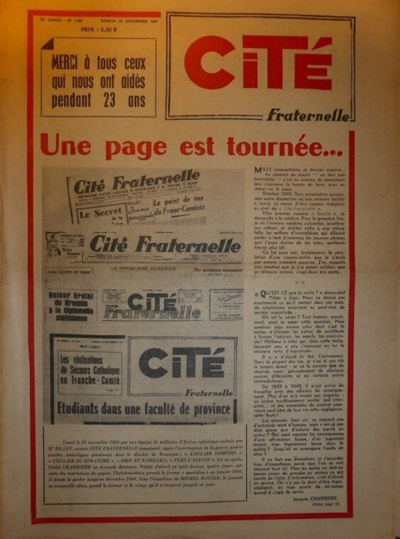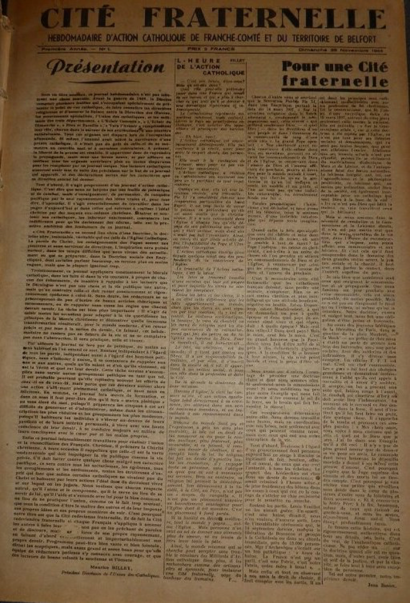 À la demande de Mgr Dubourg, il devient rapidement le directeur d’un nouvel hebdomadaire chrétien : Cité Fraternelle dont le premier numéro paraît le 26 novembre 1944 sous la direction de Maître Billey, président du comité départemental de libération du Doubs, et président diocésain de l’union des catholiques.