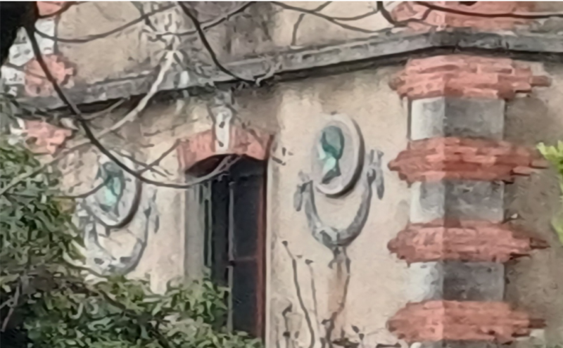 Entrée et Bow-window chargée en décorés de faïences et céramiques vernissées ! Mascaron au-dessus de l’entrée.