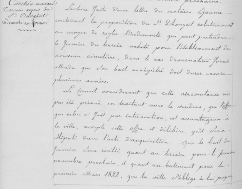 En effet, compte-tenu des inconvénients présentés par le Champ Brulley et le fait que les bisontins ne souhaitaient plus y être enterrés, compte-tenu également du fait que le cimetière de Saint Ferjeux (l’ancien cimetière alors situé à l’emplacement de la basilique actuelle) bien qu’agrandi n’offrait plus de concessions libres, les élus durent se résoudre à ouvrir un nouveau cimetière. Lors d’une délibération en date du 2 mai 1821, le conseil municipal décide l’acquisition d’un terrain appartenant au sieur Dhangest, un pharmacien. Ce dernier avait mis à disposition de la paroisse une maison située sur ce terrain afin d’y célébrer des offices religieux, l’église Saint-Martin de Bregille  ayant été détruite afin de défendre la ville lors du blocus des autrichiens de 1814.