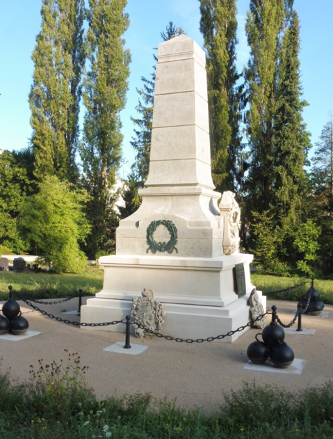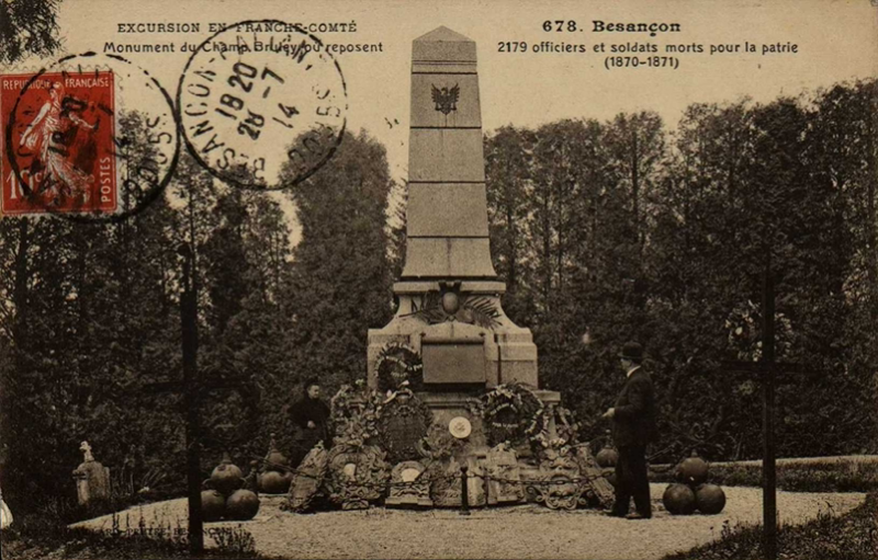 Au centre, se dresse le monument rénové en 2021, à la mémoire des 2 179 officiers, sous-officiers et soldats victimes de la guerre de 1870/1871. La bataille de janvier 1871 afin de libérer la ville de Belfort assiégée, provoquent de nombreuses victimes dans l’armée de l’Est forte de 100 000 hommes. 12 000 blessés affluent à Besançon : l’hôpital Saint-Jacques est débordé et la ville devient un gigantesque hôpital à ciel ouvert. Les 2 179 morts des suites de leurs blessures ou de leurs maladies sont donc inhumés sous ce monument et de part et d’autre dans les parties aujourd’hui engazonnées.