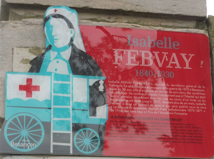 L’allée centrale a été baptisée le 10 octobre 2021 du nom d’Isabelle Febway (1840-1930) en hommage à son inlassable action au service des malades et blessés de cette guerre. A l’âge de 30 ans, elle organise alors, dans des conditions extrêmement difficiles un service d’ambulancières dans lequel s’enrôlent des dizaines de jeunes bisontines. Elle a tenu un journal de ces événements qu’elle a publié sous le titre « La défense de Besançon. Journal d’une ambulancière 1870-1871 ».