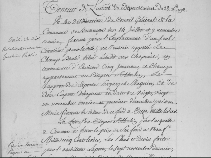 C’est ainsi que la municipalité de Besançon décide lors d’une délibération du 31 décembre 1792 d’acheter 5 journaux de terre au sieur Athalin pour la somme de 9 500 livres.