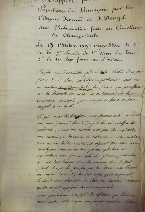 « D’après une dénonciation faite à la Société dans sa séance du 15 octobre portant qu’un particulier avait vu au cimetière du champ brûlé des linceuls qui paraissaient être la dépouille des morts, à la nommer de commissaires soussignés pour vérifier ce fait et en faire rapport à la Société.