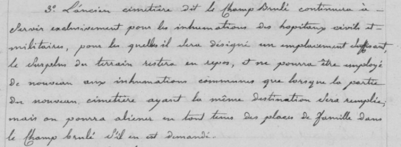 Dans un premier temps, le conseil municipal décide en 1823 que le cimetière du Champ Brulley est réservé fin d’accueillir les personnes décédées dans les hôpitaux civils et militaires.