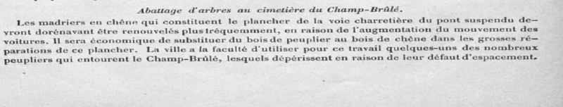 Lors d’une délibération du conseil municipal de Besançon du 29 août 1873, il est décidé de couper une vingtaine de peupliers afin de refaire la voie charretière du pont suspendu, ou pont de fil de fer (actuel pont de la République) datant de 1838. Le bois de peuplier est recommandé plutôt que le chêne utilisé à l’origine. Car les madriers de chêne ont beaucoup souffert d’un trafic passé de 160 colliers (comprendre colliers d’ânes, mulets, chevaux…) à 1 000 colliers, le péage ayant été suspendu (conseil municipal du 25 octobre 1873)….