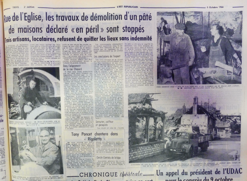 Il a donc fallu démolir ce pâté de maisons, propriété de la famille Millot, afin de permettre l’ouverture du parc sur la rue de l’Eglise. Trois artisans sont expulsés malgré leur opposition : un coiffeur, M. Jean Hermand ; un serrurier M. Marcel Dey ; un garagiste M. Henri Zurcher.