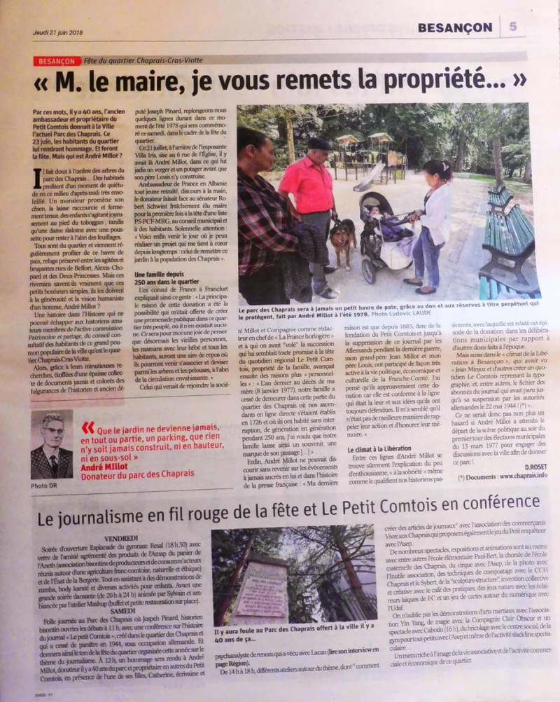 En 2018, le conseil consultatif des habitants du quartier célèbre les 40 ans de cette donation, au Parc, en présence de la fille d’André Millot, Madame Catherine Millot.