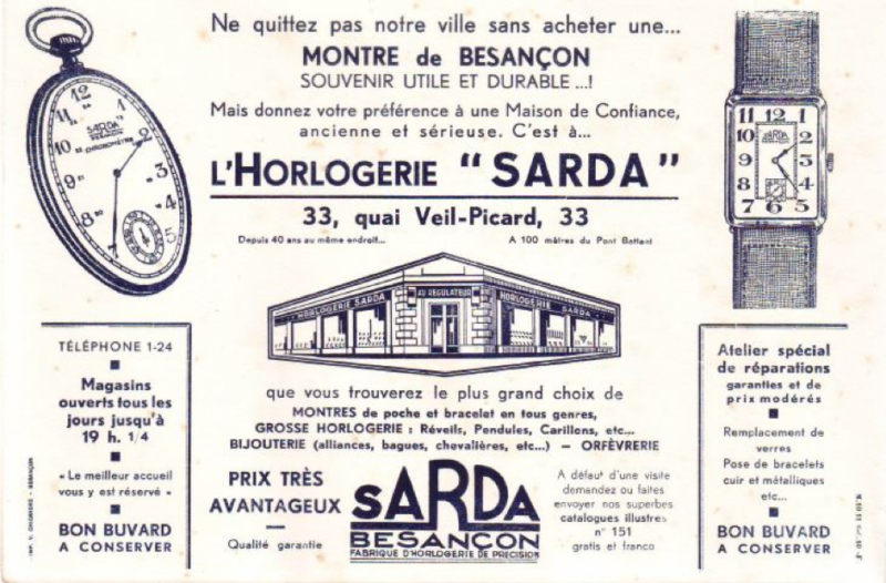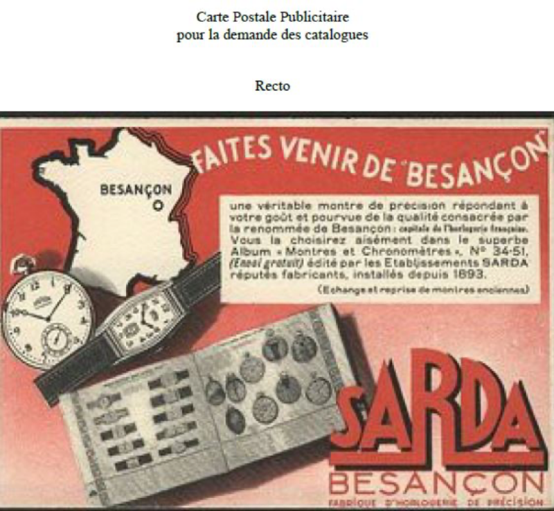 Elle a aussi fait réaliser un grand nombre de cartes postales gratuites pour la correspondance, en noir et blanc, représentant différents quartiers ou monuments de Besançon, avec les inscriptions, « Fabrique de Montres et Chronomètres H. SARDA, à Besançon (Doubs) » et « Demandez les nouveaux catalogues illustrés de plus de 250 modèles de montres », ainsi que des cartes postales avec une publicité sur les Montres Sarda au recto et l’adresse de la société pour la demande des catalogues au verso.