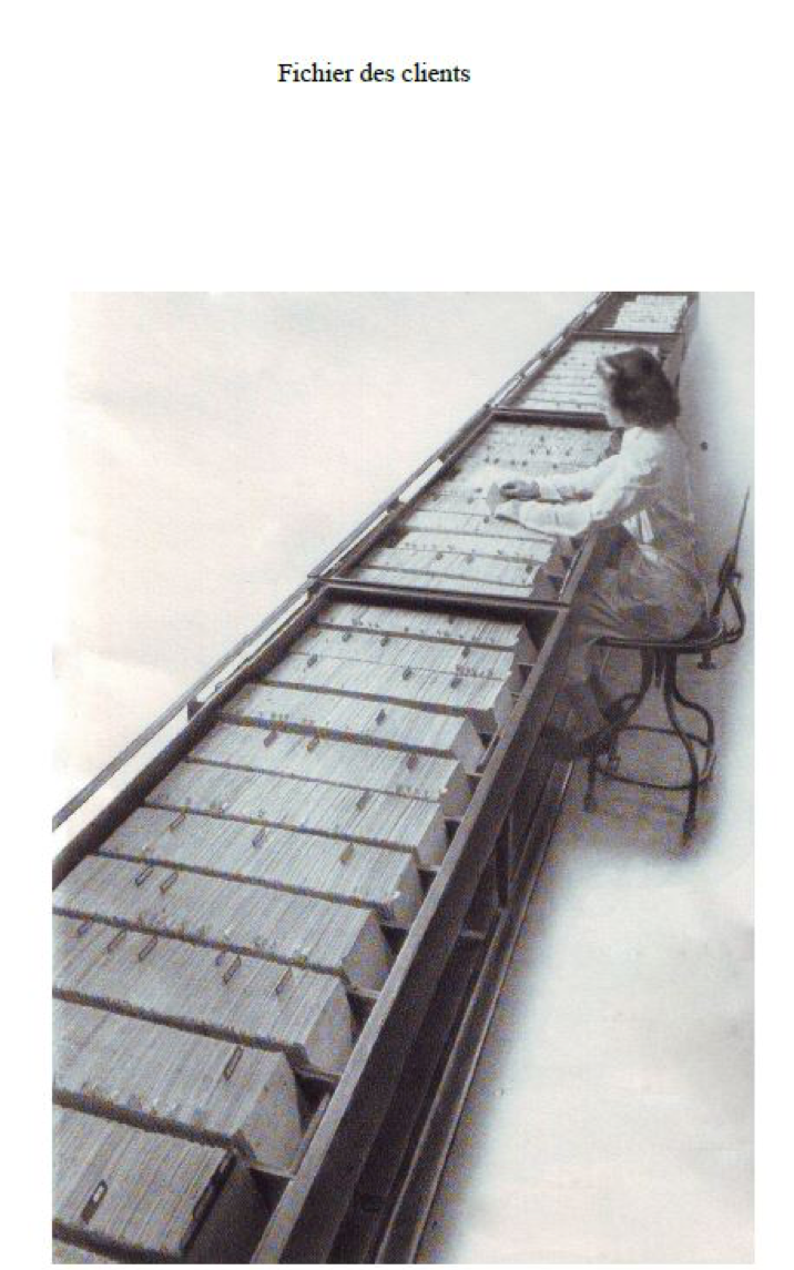 En 1958 elle possède un fichier de 200 000 « fiches-clients » de particuliers ou de collectivités répartis dans toute la France Métropolitaine et d’Outre-mer. Elle fournit ainsi de grandes entreprises et collectivités, telles: Directions Départementales de la Population, Poudrerie Nationale d’Angoulême, Régie Renault, Peugeot, Dunlop, Papier à cigarettes Lacroix, Fédération Française d’Athlétisme, Lubrifiant Igol, Amora, Société Nancéienne de Crédit, Houillères du Nord et du Pas-de-Calais, Verveine du Velay, Forges et Aciéries d’Hagondage, Union Sidérurgique Lorraine, Ateliers de Constructions de Roanne, Procures des Missions, Foyers Militaires, Chemins de Fer du Cambodge et du Cameroun, Ministère de l’Air, Institut Géographique de l’Armée, etc.