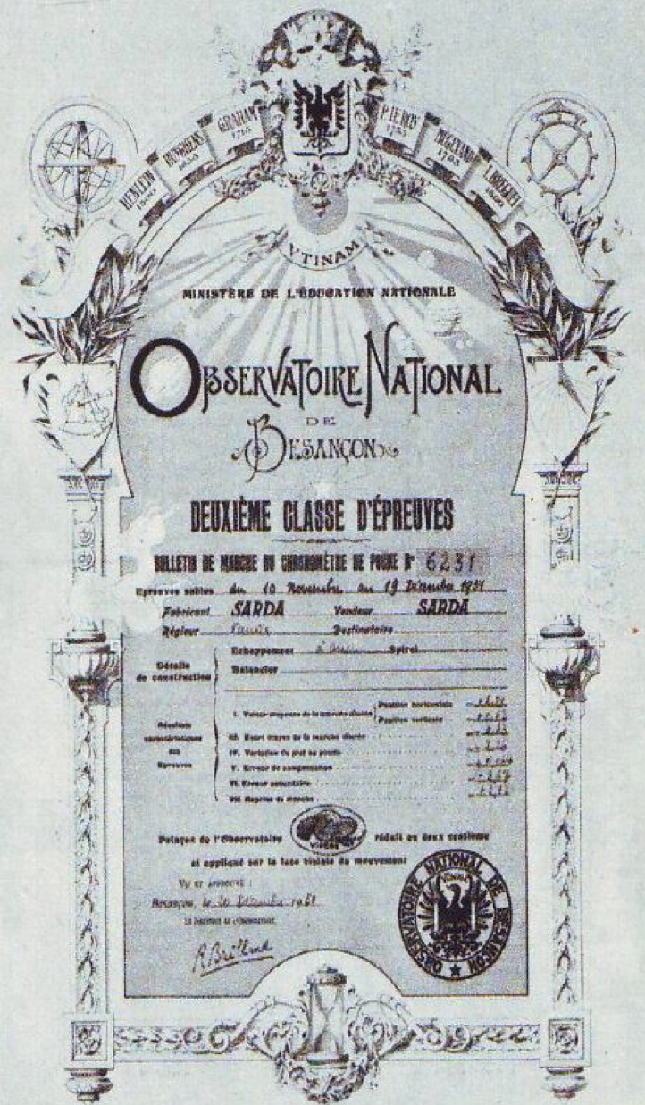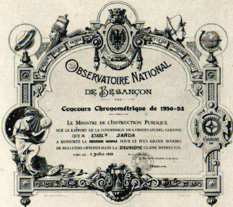 Les Chronomètres de Haute Précision participent aussi avec succès aux Concours Annuels de l’Observatoire de Besançon et la Maison Sarda, l’une des plus anciennes parmi celles déposant à l’Observatoire, s’est vue maintes fois récompensée au Palmarès des Concours Chronométriques avec en Première Classe des Diplômes de Médailles d’Or, d’Argent, de Bronze (3), et en Deuxième Classe des mentions du « plus grand nombre » de Chronomètres présentés avec succès aux épreuves.
