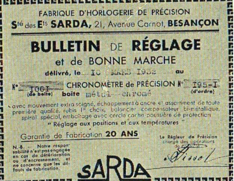En outre les régleurs de précision des Etablissements Sarda sont régulièrement récompensés par des prix du Syndicat de la Fabrique d’Horlogerie de Besançon, du Syndicat National des Fabricants d’Horlogerie de Paris, du Centre Technique de l’Industrie Horlogère, du Groupement National des Manufactures d’Horlogerie, de la Fédération Nationale de l’Industrie Française de la Montre.