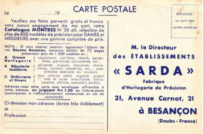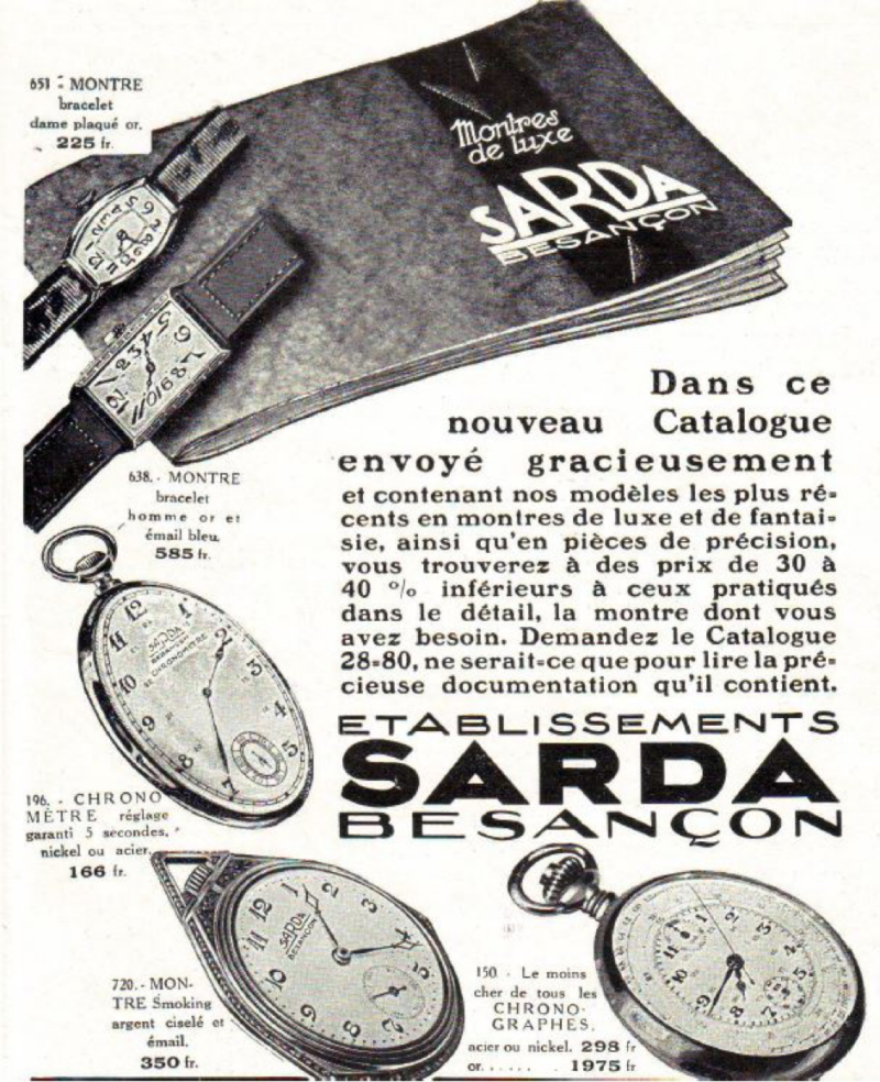La Maison Sarda compte parmi les précurseurs non seulement de la Vente par Correspondance (elle est alors la deuxième plus importante société de Vente par Correspondance dans ce domaine à Besançon, juste derrière la Maison Tribaudeau) mais aussi de la Vente Directe. En effet en tant qu’horlogers « producteurs » de la plupart de ses modèles, les Etablissements Sarda sont bien placés pour la Vente en Gros, mais la firme est surtout constituée pour la fabrication soignée et la Vente Directe aux usagers, des montres, chronomètres et chronographes qui bénéficient de prix très avantageux, 30 à 40% inférieurs à ceux pratiqués dans le détail, et à qualité égale.