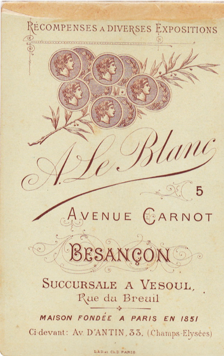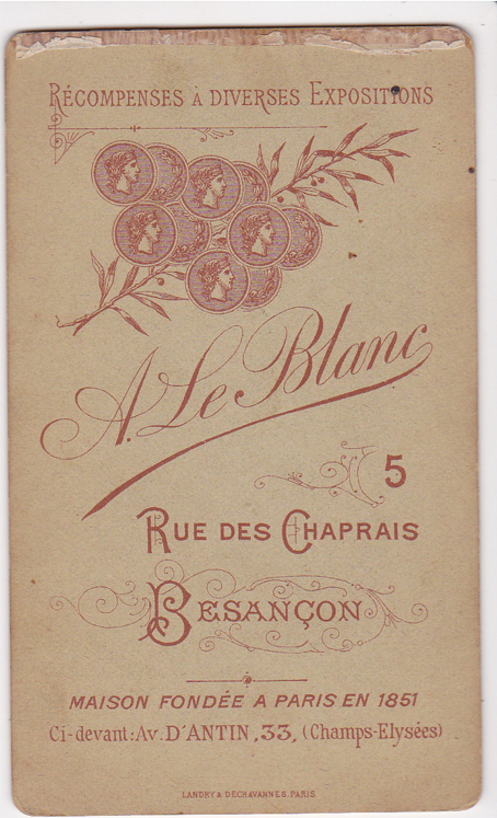 Enfin apparaît, toujours rue des Chaprais, le photographe LEBLANC, très prolifique. Les annuaires et les photos indiquent »A. LE BLANC », il semble que ce ne soit qu’une raison sociale, le photographe étant, en fait, Frédéric Louis Henri LEBLANC, venant de Dijon après avoir travaillé à Paris (où il est né en 1851), il s’installe dés 1893 au 5 rue des Chaprais ( »en face du Casino »), et opère jusqu’en 1903, avec son fils, au 5 rue Carnot (face à l’hôtel des Bains). L’enseigne deviendra »Photographie Parisienne » et ils auront une succursale à Vesoul.
