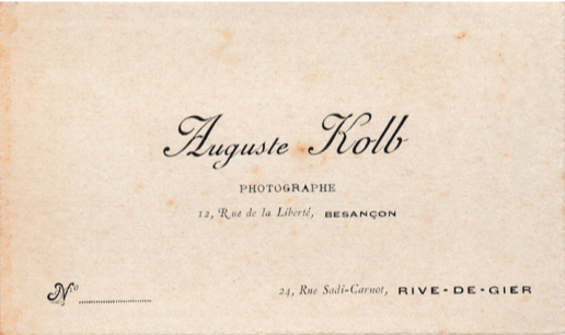 Auguste KOLB est dit photographe 12 rue de la Liberté, avant de partir à St-Etienne (42) où il décédera en 1924.