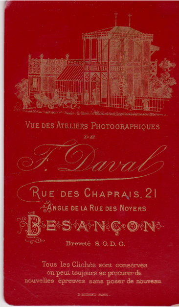 Mais à cette date apparaît Félicien DAVAL. qui semble prendre sa succession. Il arrive de Montbéliard et est cité à la Mouillère dés 1881, et jusqu’en 1894 on le trouve 21 rue des Chaprais (rue Carnot, à l’angle de la rue Krug). Sa production est importante, il a même une succursale à Dole.