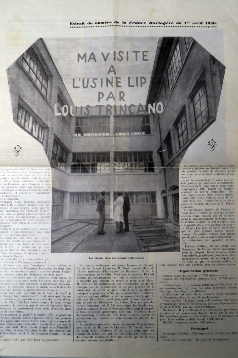 En 1930, le directeur de l’Ecole Nationale d’Horlogerie de Besançon visite l’usine Lip et rédige un article laudateur sur Lip.