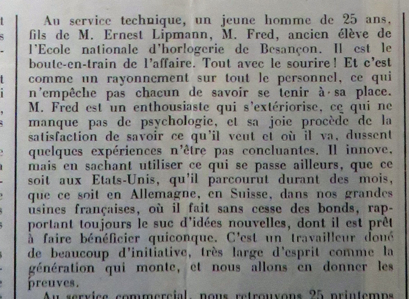 «Les congressistes visitèrent en premier lieu le bureau technique où ils furent reçus par M. Fred Lipmann administrateur, directeur technique qui leur explique en quelques mots de quelle  façon sont élaborés et dessinés les calibres. Leur montra également comment sont établis les prototypes des différentes pièces ou  instruments à l’étude. Après quoi les visiteurs furent introduits dans le laboratoire… ».