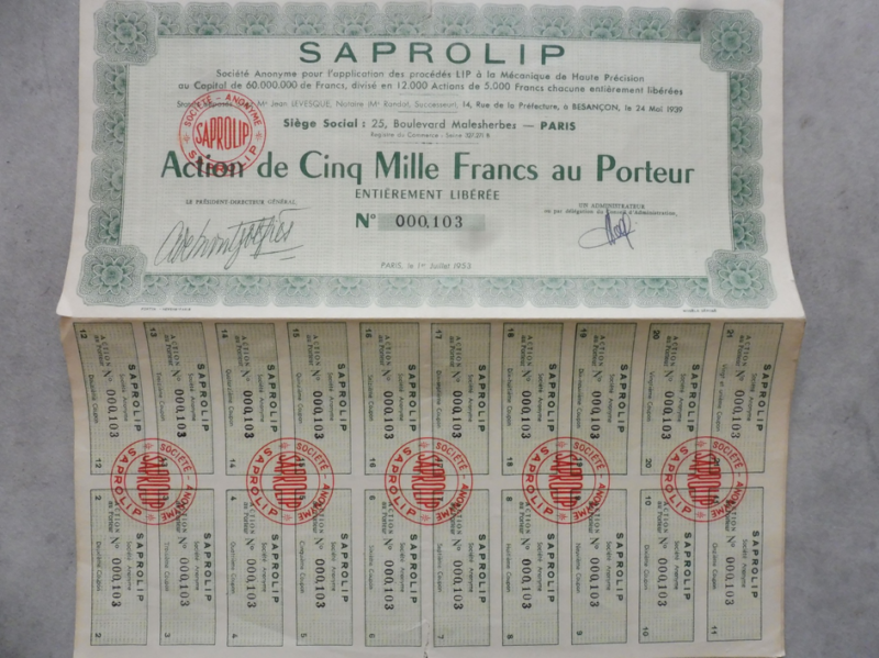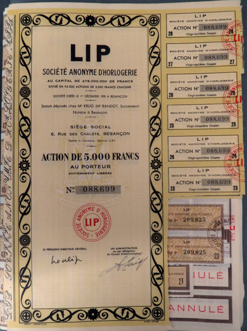 En 1931 la SA horlogerie Lipmann frères devient LIP SA. Des actions sont proposées aux concessionnaires. Mais les frères Lipmann vont se séparer dans les années 30. Camille s’en va laissant le pouvoir à Ernest.