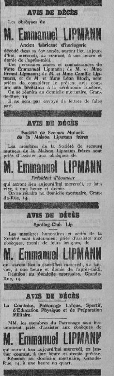 En février 1945, alors que la guerre n’est pas encore terminée et que Fred Lip a repris les commandes dans son usine de la Mouillère, il publie une lettre sous forme de communiqué commercial dans la France horlogère. Il espère que ses parents dont il n’a aucune nouvelle vont bientôt rentrer.
