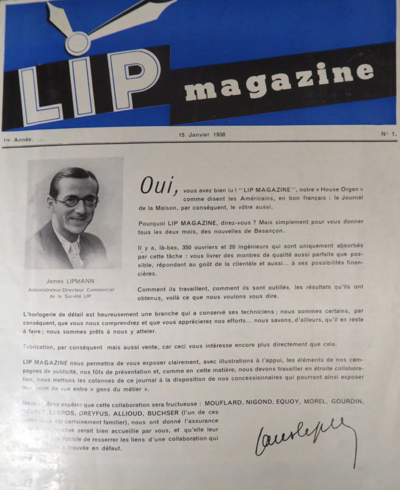 Dès la libération de Besançon, M. Fred Lippmann reprenait possession de la Société dont il assure aujourd’hui la direction générale en attendant le retour de son père, M. Ernest Lippmann, malheureusement déporté en Allemagne. Il veut que l’usine demeure toujours à l’avant-garde de l’industrie horlogère française. Il est entouré d’une équipe jeune, animée de l’esprit LIP d’avant guerre, qui désire l’aider dans ses réalisations.