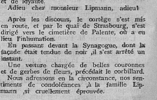 E. Lipmann est inhumé au cimetière israélite rue Anne Franck. A remarquer : le cercueil ne pénètre pas dans la synagogue bisontine, car dans la synagogue on ne célèbre que la vie.