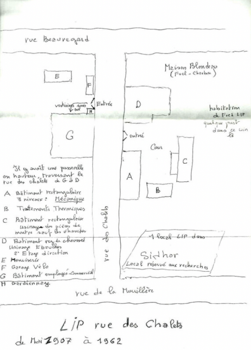 Voici, de son côté, le plan de l’usine Lip, rue des Chalets que M. Charles Piaget nous a adressé il y a quelques années.
