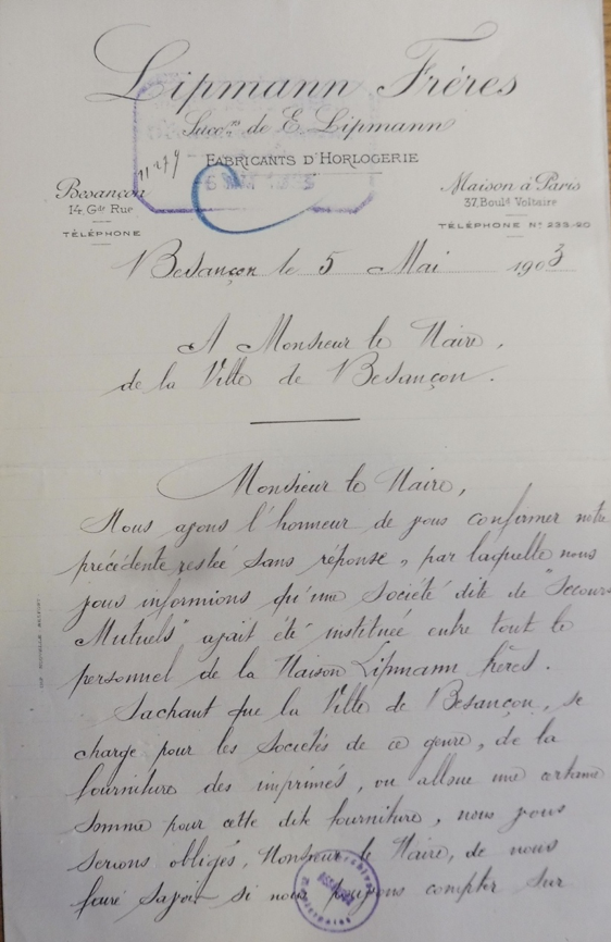 Lettre au maire en 1903 lui annonçant la création d’une mutuelle pour les salariés. Les statuts de cette mutuelle sont déposés le 12 juin 1903