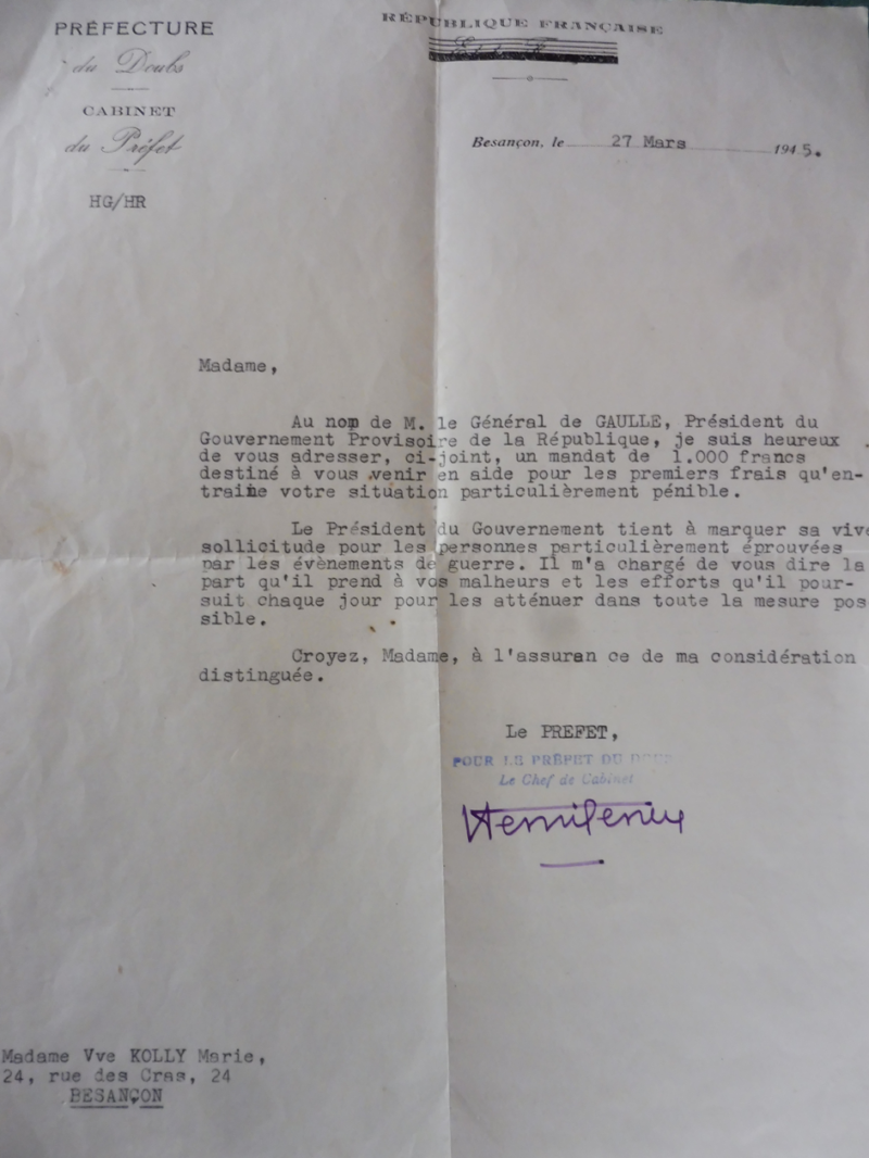 L’aide n’est certes pas négligeable puisqu’elle représenterait la somme d’un peu plus de 15 000 euros aujourd’hui. Mais Madame Kolly a 3 enfants à élever qui ne seront pas pris en charge comme pupilles de la nation puisque leur père n’est pas reconnu mort pour la France.